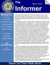 March 2022 2021InformerTheMessages from:PresidentVice PresidentRecording SecretaryFinancial Secretary2nd Vice PresidentSergeant at ArmsPolice WeekScholarshipAuxiliary TrainingState/Subordinate News:DCPennsylvaniaNever Let Them Walk Alone Punxsutawney Phil emerged from his burrow and declared six more weeks of winter. Winter weather has reached every corner of the country this season. While there is still plenty of winter weather in the next few months, the light is starting to appear at the end of the tunnel with the arrival of spring right around the corner. I encourage all members to consider volunteering in May at the National Peace Officers’ Memorial Service in Washington D.C. As you know this service cannot be accomplished without the assistance of our volunteers who unselfishly give of their time and finances to attend and support survivors. During the week volunteers are needed at the Auxiliary command hotel to stuff programs and prepare bus bags. Volunteers are needed at survivor and escort registration at the COPS host hotels, May 15th, day of the service; volunteers are needed onsite to help with setup, distribution of water and programs, and at survivor’s hotels with coordinating loading of buses and providing support to survivors on buses. During the service volunteers are needed to help with line-up, movement at wreath and medallion tables, and maintaining clear aisles around seating. Come for the week or just for a day; volunteers are needed throughout. We will have an auxiliary booth at tent city and at lodge 1; stop by and visit our booth. If you are available while in DC consider volunteering a few hours at one or both of the booths. See information and link in this edition to sign up. Watch the National Auxiliary Facebook page for upcoming zoom talk that will offer information and answer questions on volunteering during Police Week. I hope you will consider attending Police Week this year and offer your support for the events. The Auxiliary will again utilize the Homewood Suites by Hilton in Springfield Virginia as our host hotel. The hotel offers king bed studio suites that have pull out sofa bed and kitchen for $159.00 plus tax and one bedroom king suite that have pull out sofa bed and kitchen for $169.00 plus tax. (Note: one bedroom suites are limited and will be reserved on first come first serve basis.) Free breakfast bar and free parking are provided. We will provide transportation for volunteers from our hotel with our auxiliary vans to volunteer spots. The Rooming Request Form is included in this Informer. Rooms will go fast and must be booked through the National Auxiliary to receive the special rate. All reservations forms must be returned to me by March 31st. The National Auxiliary is very proud to stand behind and support the men and women of the Fraternal Order of Police and Law Enforcement.